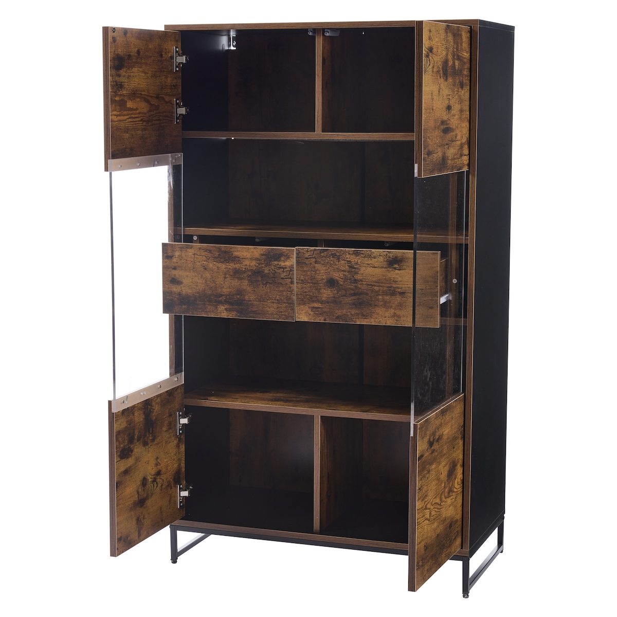 OKWISH Vitrine Aufbewahrung LED Licht Acryl Schrank 2 Türen 2 Schubladen 80x40x138cm Schwarz Holzmaserung Modern Wohnzimmer Retro