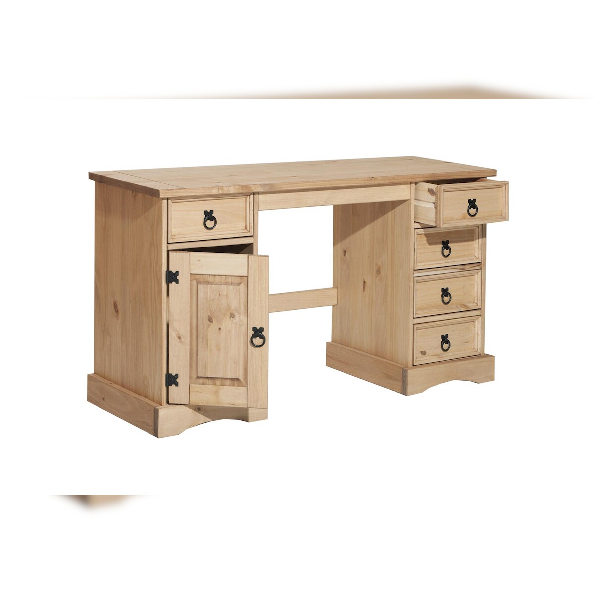 Möbilia Schreibtisch | 5 Schubladen, 1 Tür | Kiefer-Holz massiv | B 140 x T 48 x H 76 cm | honigfarbend, gewachst | 19020033 | Serie SCHREIBTISCH