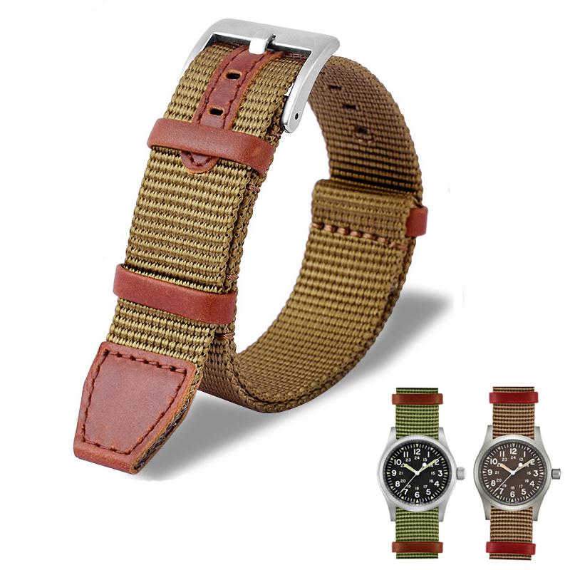 20mm 22mm Vävband i nylon + Äkta läderrem för Hamilton Khaki Green Field Watch H69439931 441 Herr Utomhus Sport Klockarmband