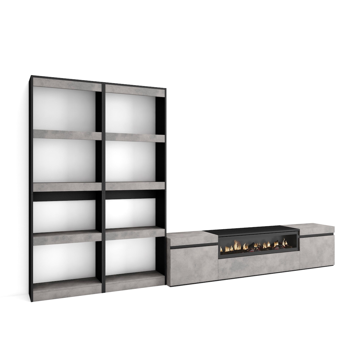 SKRAUT HOME Wohnzimmer-TV-Schrank, Wohnzimmer-Wandsystem, 320x186x35cm, Für TV-Geräte bis zu 80“, Elektrischer Kamin, Moderner Stil, Zementgrau - 96_6
