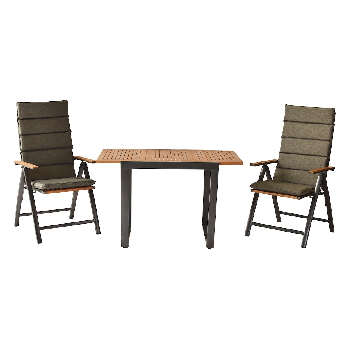 Merxx Athos Gartenmöbel Set 5tlg., 2 Klappsessel, 2 Auflagen, 1 Balkonausziehtisch 80 (120) x 70 cm, Aluminium/Akazie