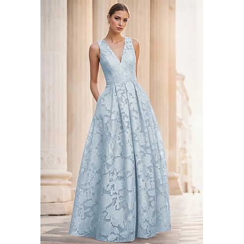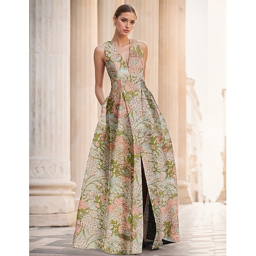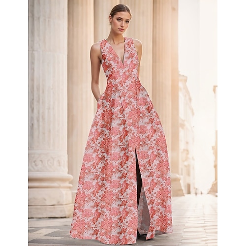 Linea ad A Lunghezza al pavimento Abito da Sera Da principessa Abito formale Elegante Spacco Alto Senza Maniche Scollo a V Matrimonio Formale Tasca Jacquard con Tasca