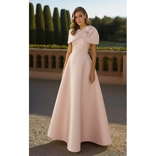 Linea ad A Lunghezza al pavimento Abito da ballo con mantello Abito da Sera Elegante Setoso Manica Corta Girocollo Matrimonio Formale Raso con Cristalli Fiore sulla Spalla