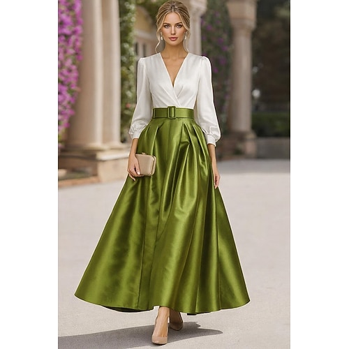 Linea ad A Lunghezza al pavimento Lunghezza alla caviglia Abiti da Cocktail Elegante Manica Lunga Scollo a V Festa in giardino Matrimonio Raso Taffetà con Pieghe Arricciato