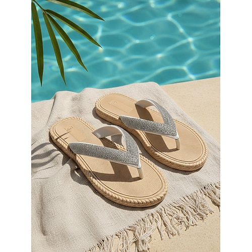 infradito da donna con strass scintillanti: comodi sandali bassi con suola in corda intrecciata, calzature estive casual per piscina, spiaggia e vacanze