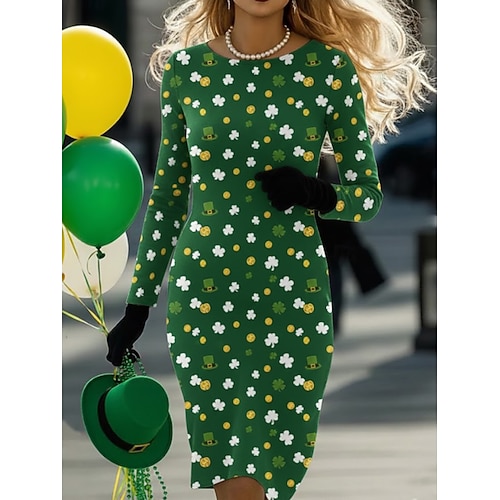 Vestito corto da donna per la festa di San Patrizio, stile casual, quotidiano, da festa, vestibilità regolare, a quadri, a quadri, a quadri, a maniche lunghe, girocollo, verde scuro, verde, estate,