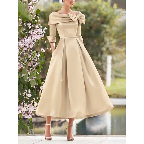 Linea ad A Lunghezza Tè Abiti da Cocktail Abiti da festa Elegante Vintage Manica 3/4 Collo quadrato Matrimonio Formale Tasca Raso con Fiocco/Fiocchi Tasca