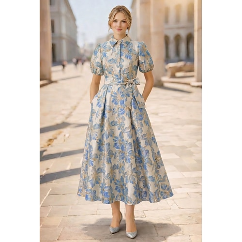 Linea ad A Lunghezza Tè Abiti da Cocktail Elegante Vintage Floreale Manica Corta Colletto a Camicia Festa in giardino Matrimonio Tasca Jacquard con Fiocco/Fiocchi Tasca