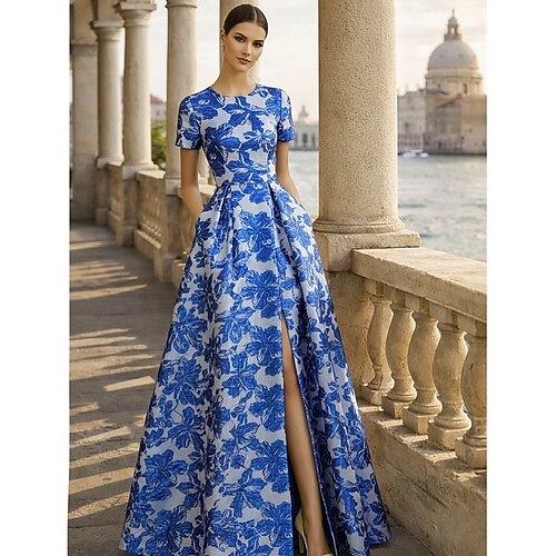 Linea ad A Lunghezza al pavimento Abiti da Cocktail Elegante Vintage Floreale Manica Corta Girocollo Festa in giardino Matrimonio Tasca Jacquard con Stampa floreale Pieghe Tasca