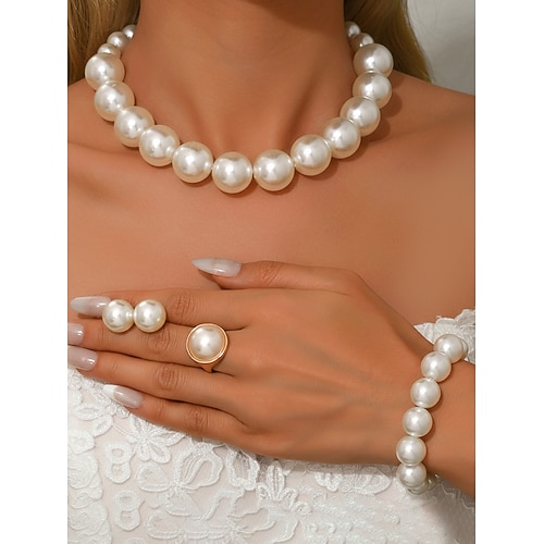elegante set di gioielli di perle da donna - collana di perle finte lucide, braccialetto anello importante, stile classico da sposa per spose, damigelle cerimonie nuziali