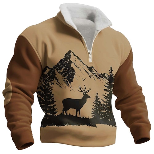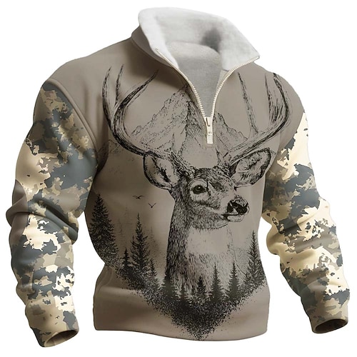 Per uomo Cervo Pile Felpa Moda Casual 3D Da caccia Collo alla coreana Zip a un quarto All'aperto Abbigliamento casual alla moda Vacanza Regalo Marrone Cachi Grigio scuro Grigio Mezza cerniera Autunno