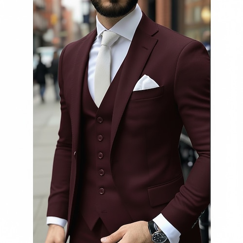 Uomo Matrimonio Casuale Abiti da lavoro Bavero classico Nero Borgogna Quotidiano Affari Tinta unita Vestibilità su misura 3 pezzi Monopetto a un bottone