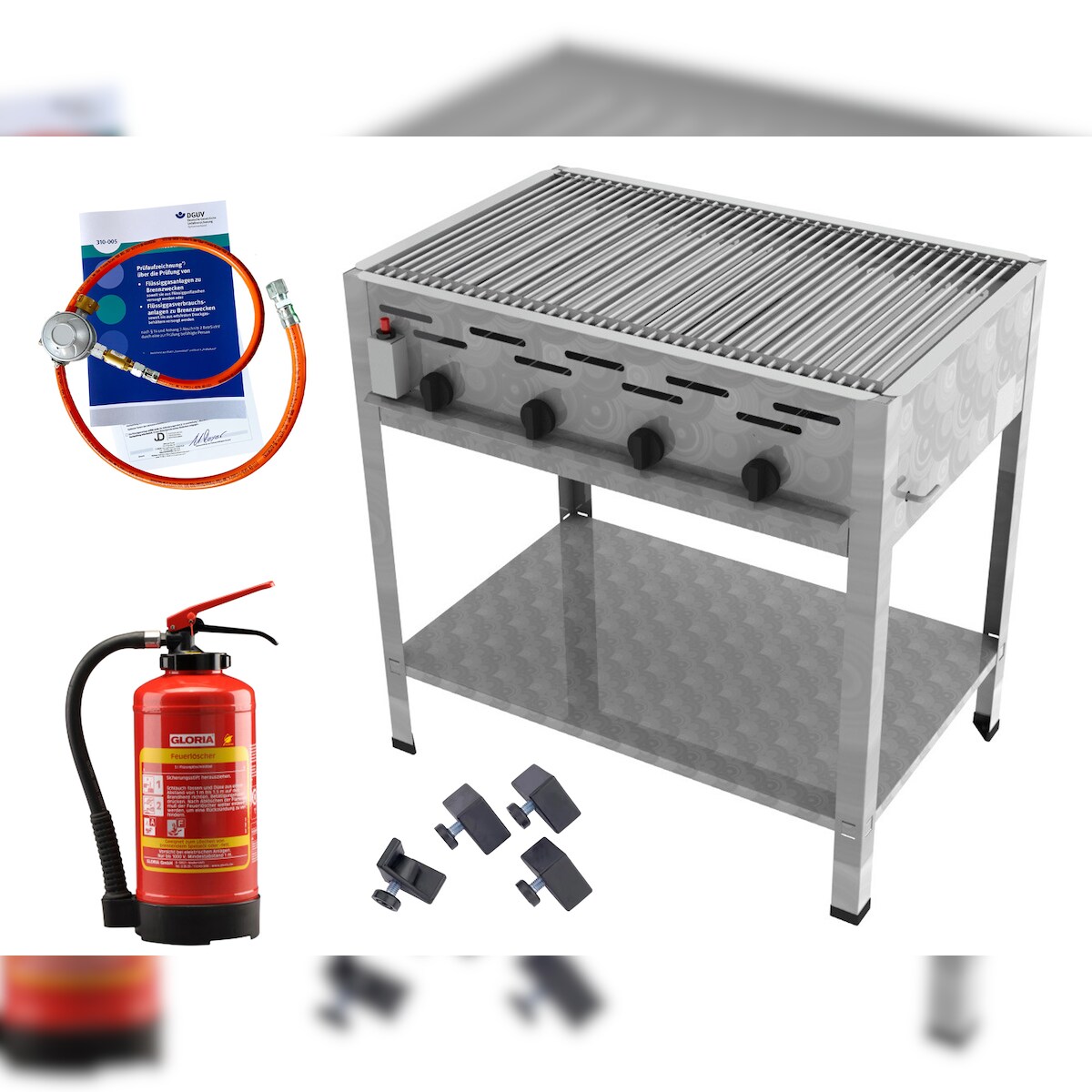 Gasbräter 4-flammig Edelstahl 18kW ChattenGlut mit GLORIA FA3 EASY Fettbrandlöscher Gasdruckprüfung, Gewerberegler, ideal für Gastro Events
