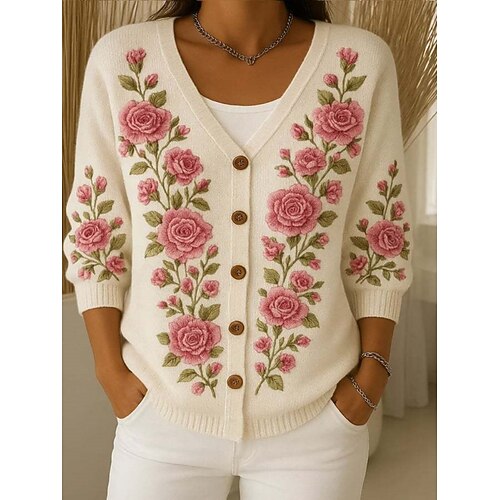 Per donna Felpa Cardigan Elegante Vintage Moda Floreale A Coste Scollo a V Tasca Bottoni Lavorato a maglia Manica Lunga Top Regolari Maglia All'aperto Quotidiano Weekend Bianco Giallo Primavera