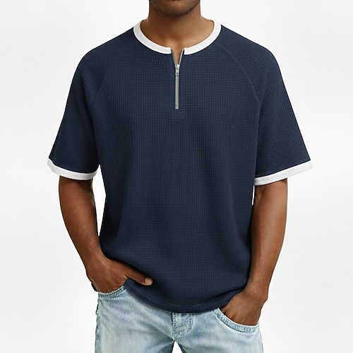 Da uomo Maglietta Waffle Maglietta Manica Corta Girocollo Con cerniera Estate Primavera Tinta unica Testurizzato Moda Designer Casual Cerniera Frontale Manica corta Casuale Quotidiano All'aperto Blu