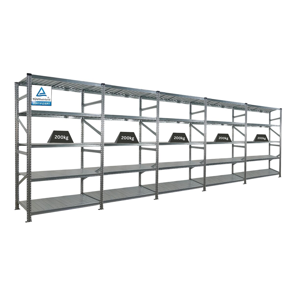 PROREGAL Fachbodenregal PROXIMO Stecksystem | Komplettregal | HxBxT 200x600x60cm | 5 Ebenen | Fachlast 200 kg | Beidseitig nutzbar | Verzinkt