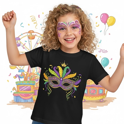 100% Cotone Carnevale di Martedì Grasso 2026 Bambini Ragazze Blu Nero Bianco Grafico Maschera Maglietta Girocollo Manica Corta Vacanza Sport Outdoor Abbigliamento Quotidiano Attivo Vacanza Casual