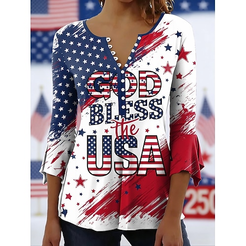 camicetta da donna per il giorno dell'indipendenza americana, grafica, bandiera americana, elegante, alla moda, manica a 3/4, girocollo, top normali, per tutti i giorni, per uscire, bottoni con