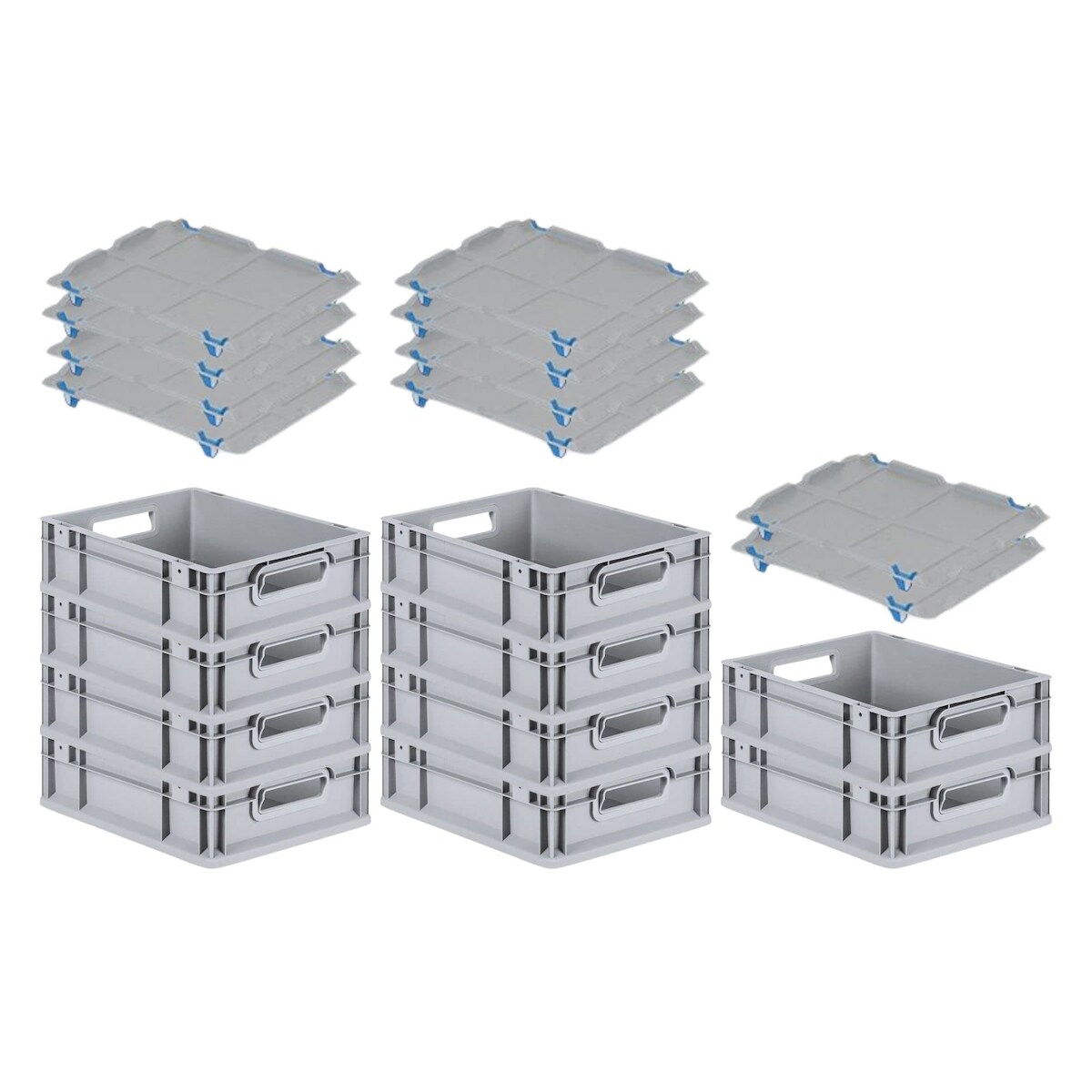 PROREGAL SparSet 10x Eurobox NextGen Grip mit Auflagedeckel & 4 blauen Verschlüssen, HxBxT 12x30x40cm, 11L, Grau, Griffe offen, Eurobehälter