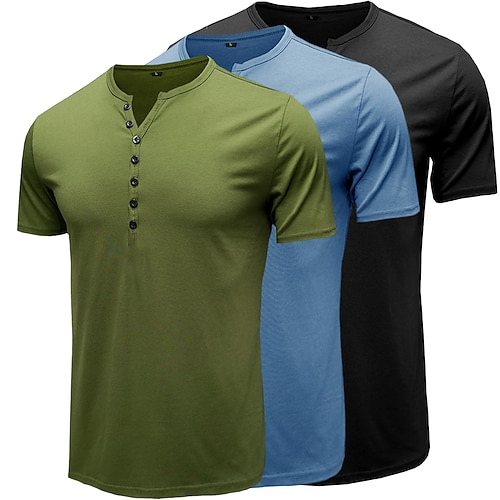 Maglietta da uomo 3 pezzi in misto cotone 80%, manica corta, tinta unita, semplice, con bottoni, stile Henley, casual, per tutti i giorni, estate e primavera maglietta Henley blu e nera per tutte le