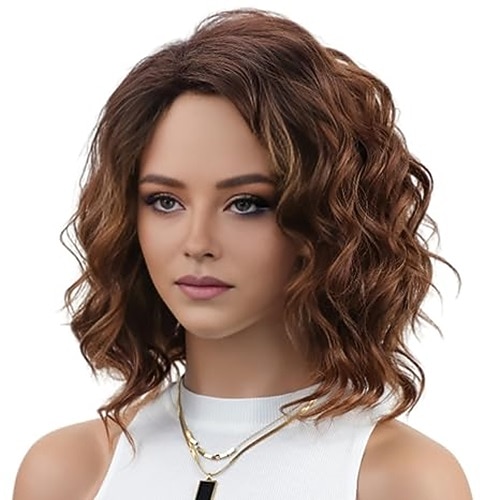 parrucca corta ondulata a strati parrucche ricce per donne parrucca sintetica a calore con riga laterale