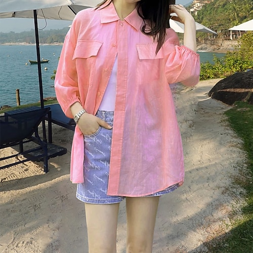 Per donna Camicia Blusa Semplice Attivo Casual Manica Lunga Colletto a Camicia Top Regolari Quotidiano Ferie Uscire Tasca Bottoni Rosa Estate Primavera