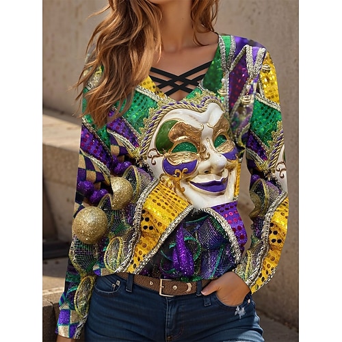 Carnevale Martedì grasso Per donna Maglietta Grafico Astratto Vintage Elegante Classico Manica Lunga Scollo a V Top Regolari Quotidiano Taglio Stampato Viola Verde Estate Primavera Autunno