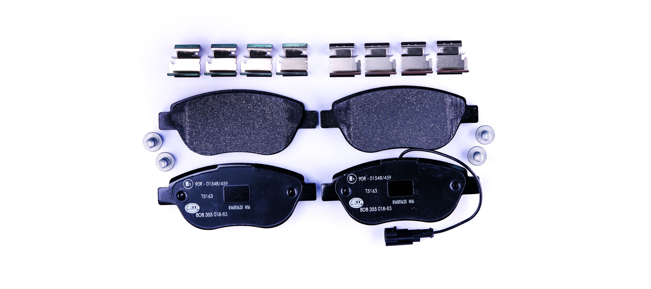 HELLA Bremsbelagsatz, Scheibenbremse vorne rechts links mit Zubehör für ALFA ROMEO PEUGEOT GENERAL MOTORS FERRARI FIAT AMC VAUXHALL LANCIA OPEL 773650