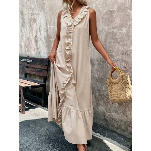 Per donna Normale Abito maxi Misto cotone Vestito Casual Hawaiano Casual Vacanza Data Vestibilità regolare Semplice Senza Maniche Scollo a V Cachi Estate