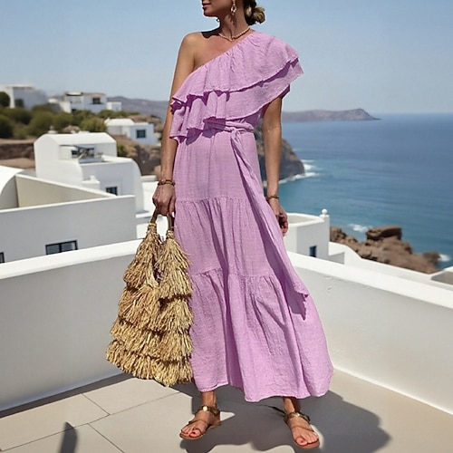 Per donna Abito Midi Abito in cotone e lino Abiti Peplo Moda Moderno All'aperto Uscire Weekend Vestibilità comoda Semplice Senza Maniche Monospalla Rosa Azzurro Estate Primavera