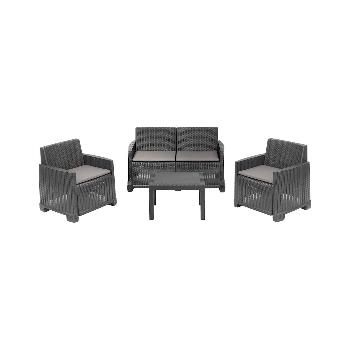 Dmora Outdoor-Lounge-Set Dbagnolin, Gartenkomposition mit 2 Sesseln, 1 Sofa und 1 Couchtisch, Rattan-Effekt mit Kissen, 100 % Made in Italy, Anthrazit