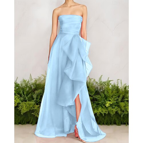 Abito da Sera A-Line Stile Celebrità Abito Elegante Ospite di Matrimonio Lunghezza Pavimento Senza Maniche Spallina Unica Organza con Rouches Arricciate Fessura
