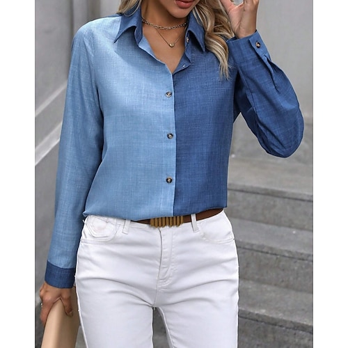 Per donna Camicia Blusa Blocco di colori Elegante Moderno Casual Manica Lunga Colletto a Camicia Top Regolari Quotidiano Ferie Uscire Patchwork Bottoni Blu Arancione Verde Estate Primavera