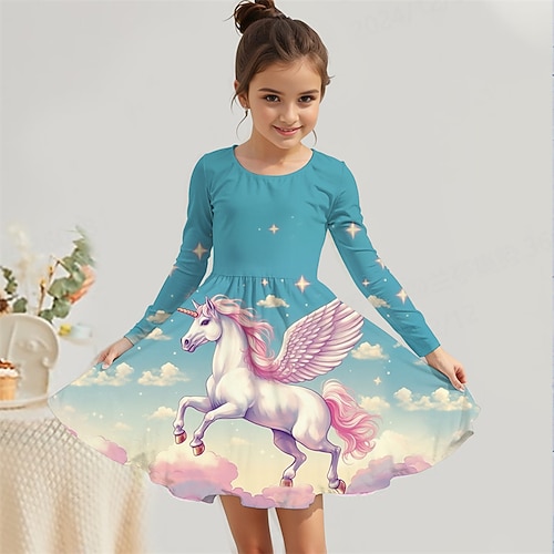ragazze' 3D Animali Unicorno Vestito Manica lunga Stampa 3D Primavera Autunno Da mare Giornaliero Per eventi stile sveglio Informale Dolce Bambino 3-12 anni Abito linea A Sopra il ginocchio Standard