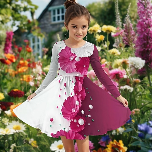ragazze' 3D Floreale Abito Manica Lunga Estate Primavera Vacanza Quotidiano Ferie Principessa Bello Dolce Bambini 4-12 Anni Vestito Casual Abito a trapezio Lunghezza al ginocchio Vestibilità regolare