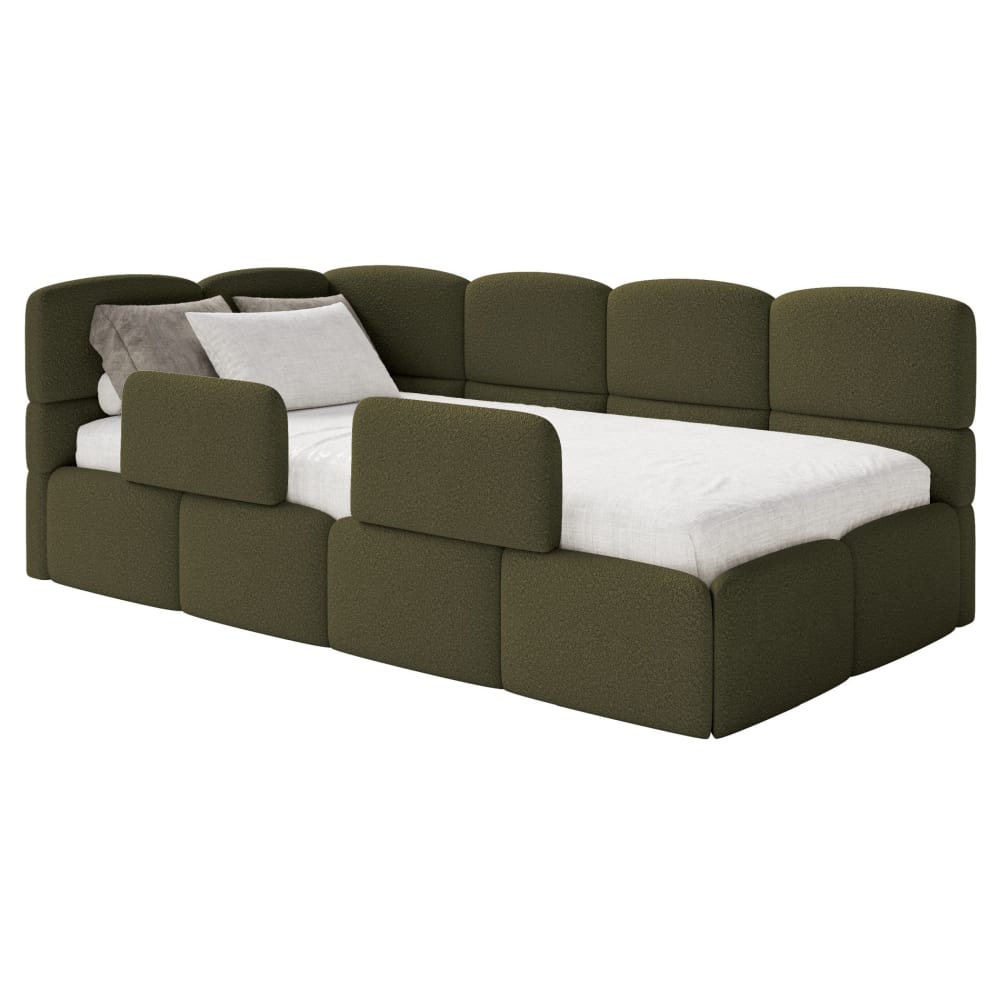Lit ado 90x200, gauche, avec matelas et barrière, en bouclette olive
