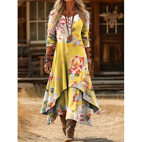 Per donna Abito Midi Abito a Tubino Casual Quotidiano Ferie Vestibilità regolare Floreale Grafico Manica Lunga Girocollo Giallo Viola Autunno Inverno