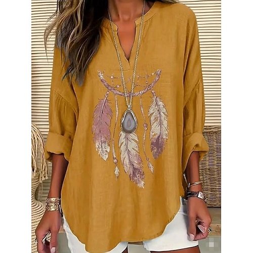 Per donna Camicia Tunica Grafico Piuma Bohemien Vintage Quotidiano Manica Lunga Scollo a V Top Regolari Quotidiano Ferie Stampato Giallo Estate Primavera