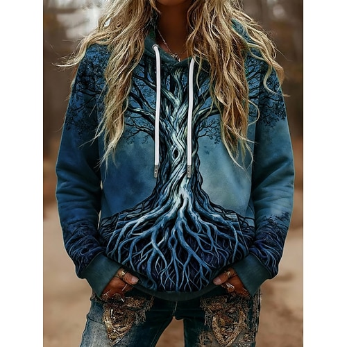 Felpe con cappuccio da donna in stile vichingo, grafiche, vintage, casual, a maniche lunghe, con cappuccio, normali, da indossare tutti i giorni, casual, sportive, con coulisse, tasca, stampa, blu,
