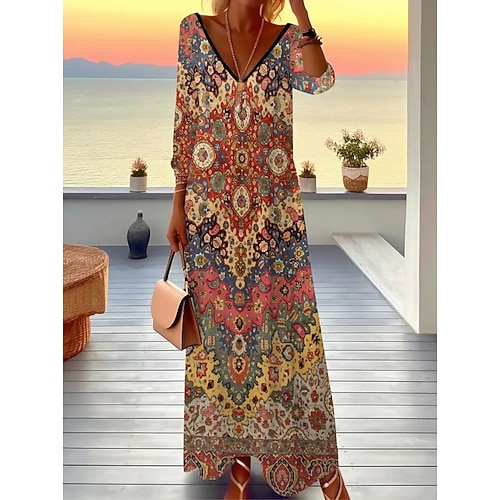 Per donna Abito Midi Vestito T-Shirt Abito a trapezio Vacanza Casual Boho Quotidiano Ferie Data Vestibilità regolare Floreale Grafico Geometrico Manica Lunga Scollo a V Marrone Scuro Bianco Rosso