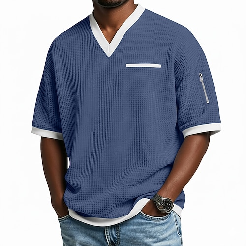 Per uomo Maglietta a Maglia Waffle Maglietta Manica Corta Scollo a V Estate Testurizzato Moda Designer Confortevole Patchwork Tasca Blocco di colore Casuale Quotidiano All'aperto Blu chiaro Nero Viola