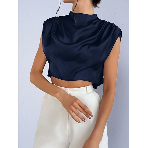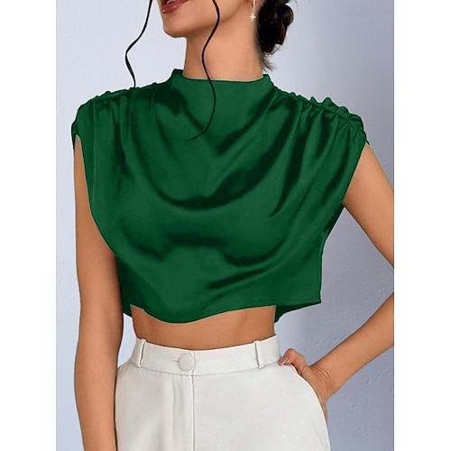 Per donna Camicia Camicia in raso Blusa Top corto avvolgente Arricciato Semplice Vintage Elegante Classico Manica Corta Collo Alto Top corti Quotidiano Ferie Uscire Nero Bianco Blu marino Marrone