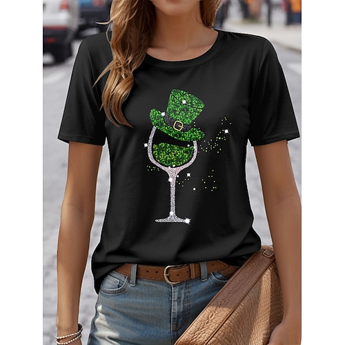 Maglietta da donna per il giorno di San Patrizio con stampa calice di vino casual a manica corta girocollo top regolari stampa quotidiana nera estate