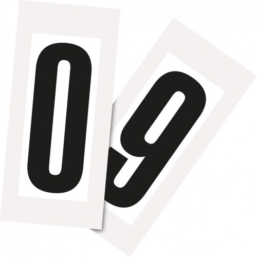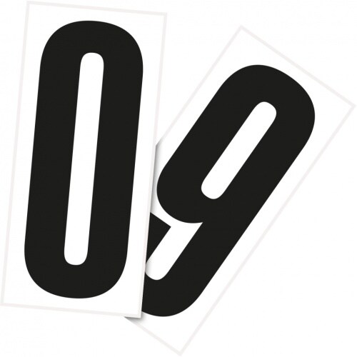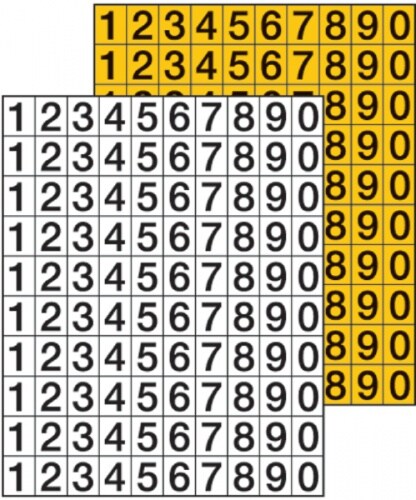 Klebezahlen, 0-9, schwarz/weiß oder schwarz/gelb - 1 Bund = 100 Ziffern - 270x186 mm Folie selbstklebend