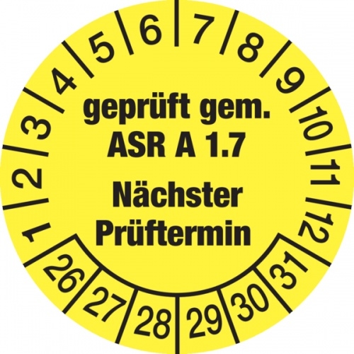 König Werbeanlagen Prüfplakette ab 26, ASR A1.7 Nächster Prüftermin, gelb/schwarz, Folie, Ø 30 mm - Bogen = 10 Plaketten - 30 mm Folie selbstklebend