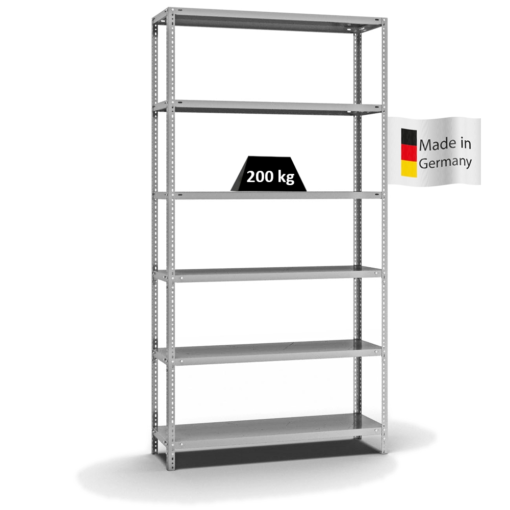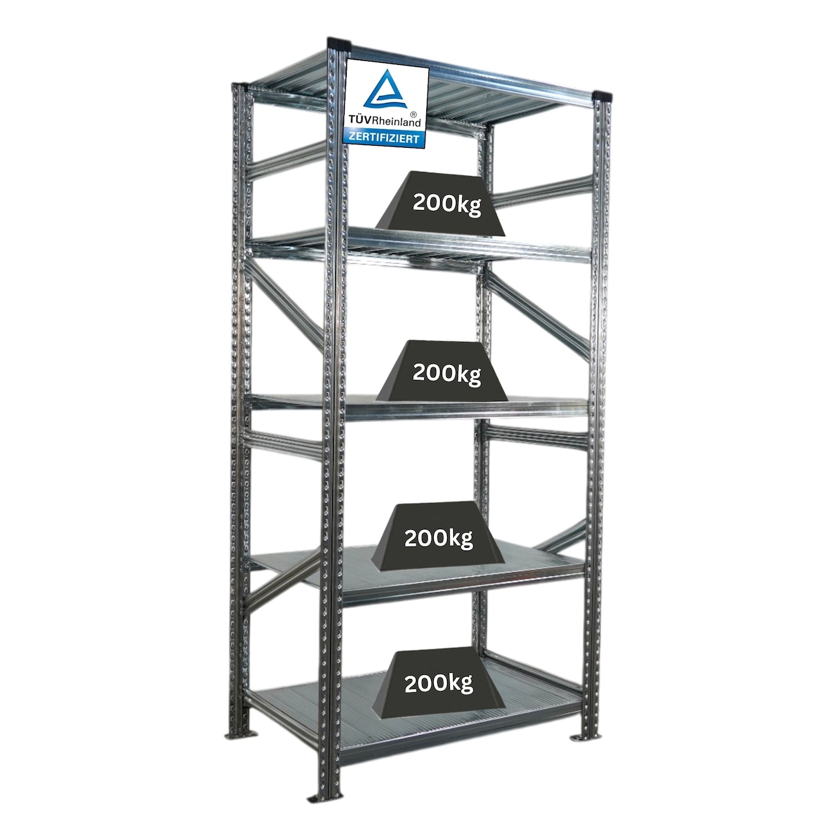 PROREGAL Fachbodenregal Schraubsystem | Grundregal | HxBxT 200x100x30cm | 5 Ebenen | Fachlast 200 kg | Beidseitig nutzbar | Verzinkt