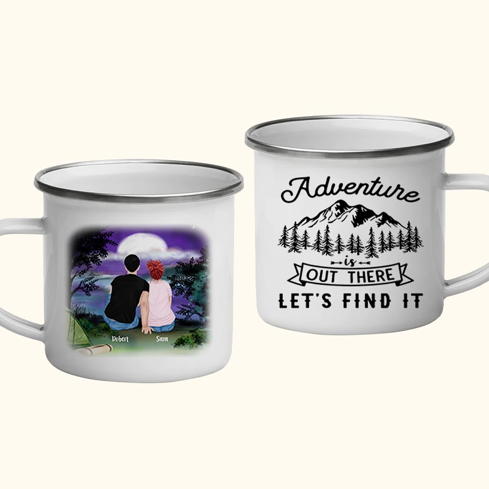 Personalisert Eventyret er der ute, la oss finne det 11 oz Night Family Camping Emaljekrus med håndtak Bærbar, lett og enkel å rengjøre Bursdagsgave