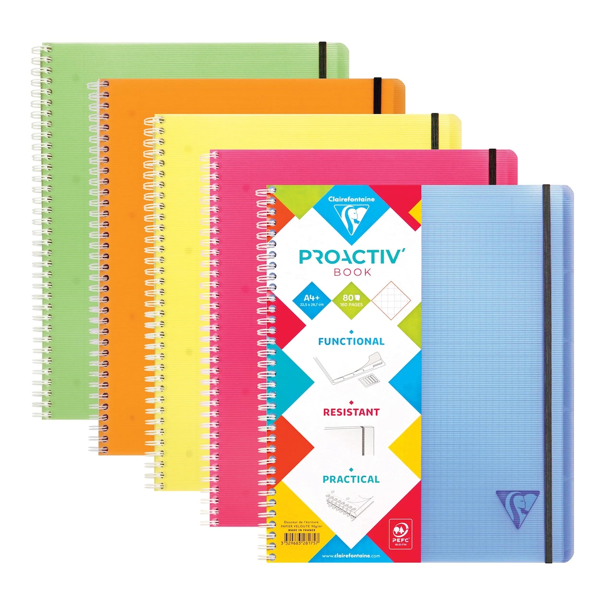 Clairefontaine 5x Linicolor FRESH, PROACTIV'BOOK mit Doppelspirale 22,5x29,7 cm, 80 Bl 90g kariert mit Rand, Einband PP - Sortiert 328175C