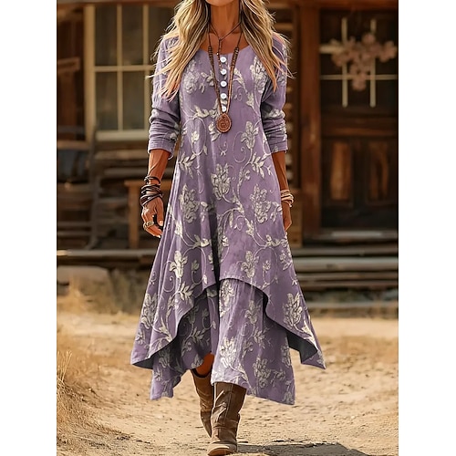 Per donna Abito Midi Tubino Vestito T-Shirt Vacanza Casual Quotidiano Vestibilità regolare Floreale Grafico Manica Lunga Girocollo Blu Viola Arancione Verde Primavera Autunno Inverno