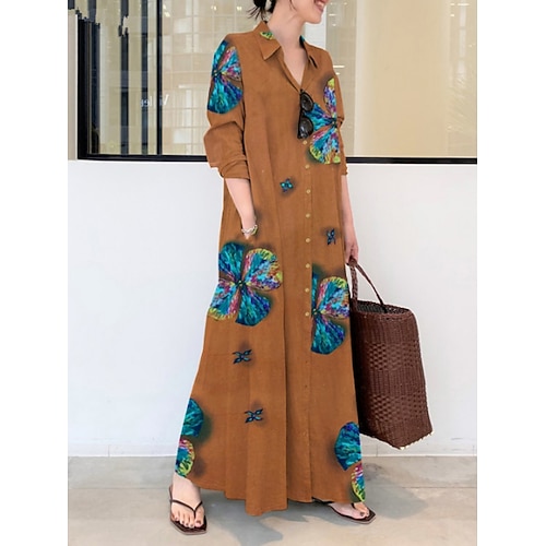 Per donna Abito maxi Abito a Tubino Vacanza Casual Quotidiano Vestibilità regolare Floreale Manica Lunga Colletto a Camicia Giallo Rosso Blu marino Arancione Estate Primavera Autunno